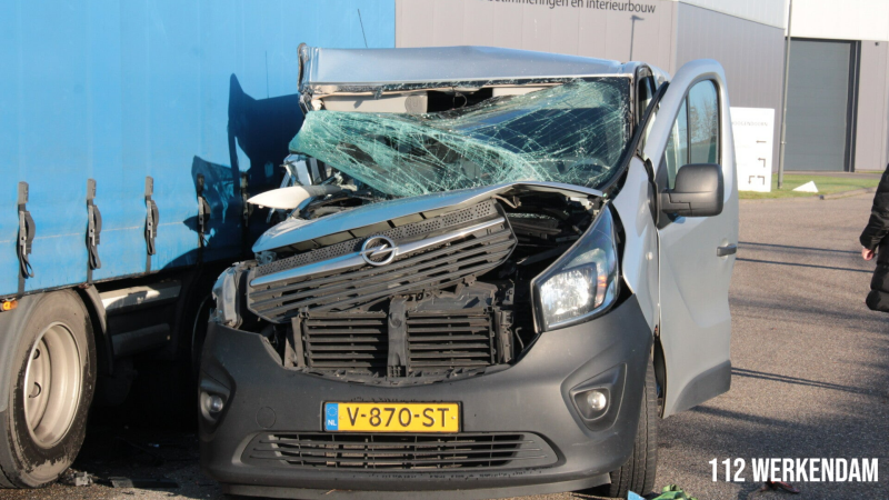 Een bedrijfsbus was tegen een geparkeerde vrachtwagen gebotst. De bus raakte zwaar beschadigd. De bestuurder is nagekeken door het ambulancepersoneel maar hoefde niet mee naar het ziekenhuis.